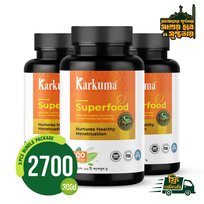 কারকুমা সুপারফুড একটি কার্যকরী খাদ্য পণ্য, বিশেষভাবে মহিলাদের মাসিকের স্বাস্থ্যের উন্নতির জন্য তৈরি করা হয়েছে। এর সমস্ত কাঁচামাল হল ইউনাইটেড স্টেট ডিপার্টমেন্ট অফ এগ্রিকালচার (ইউএসডিএ) জৈব প্রত্যয়িত এবং বিশ্বের বিভিন্ন প্রামাণিক উত্স থেকে সংগৃহীত।