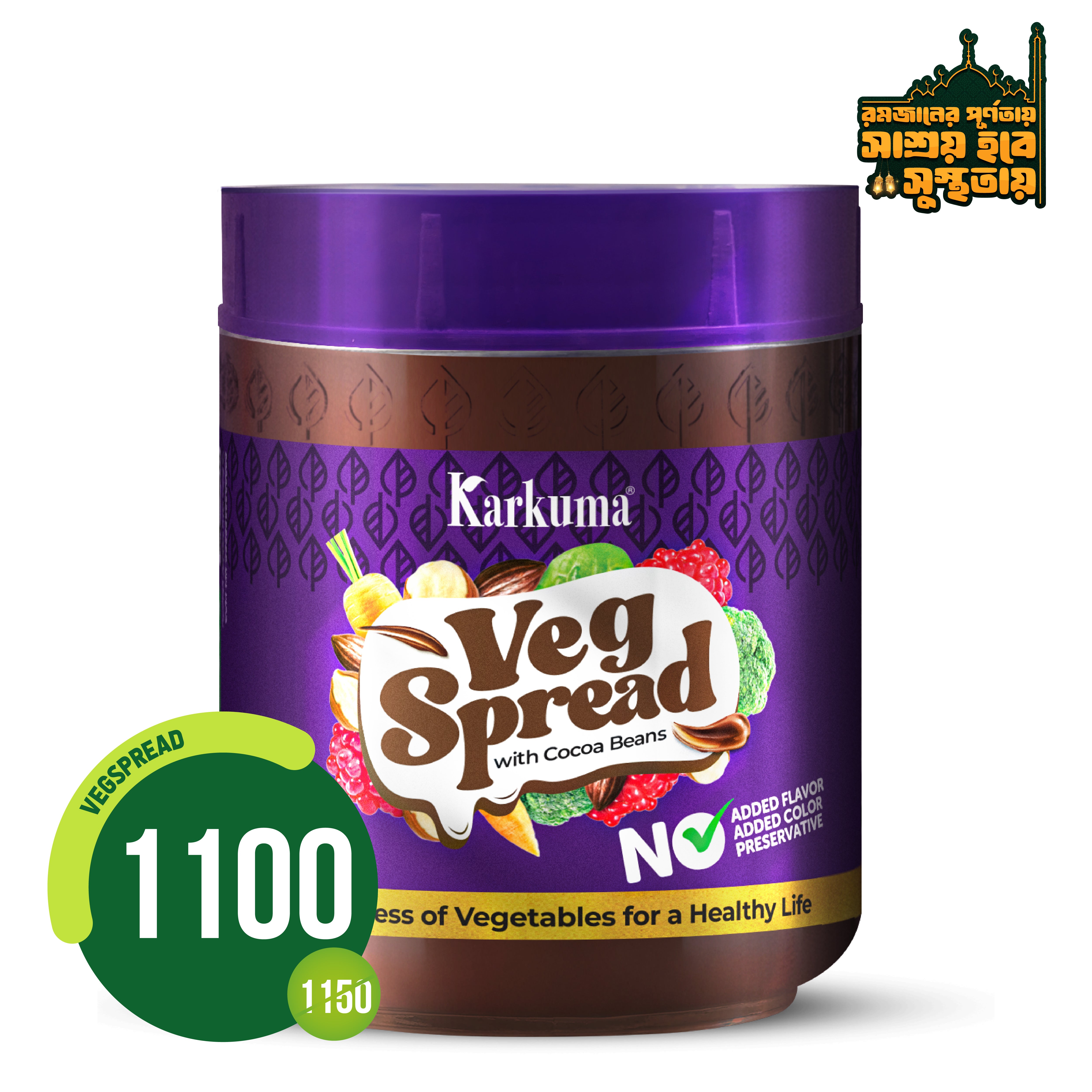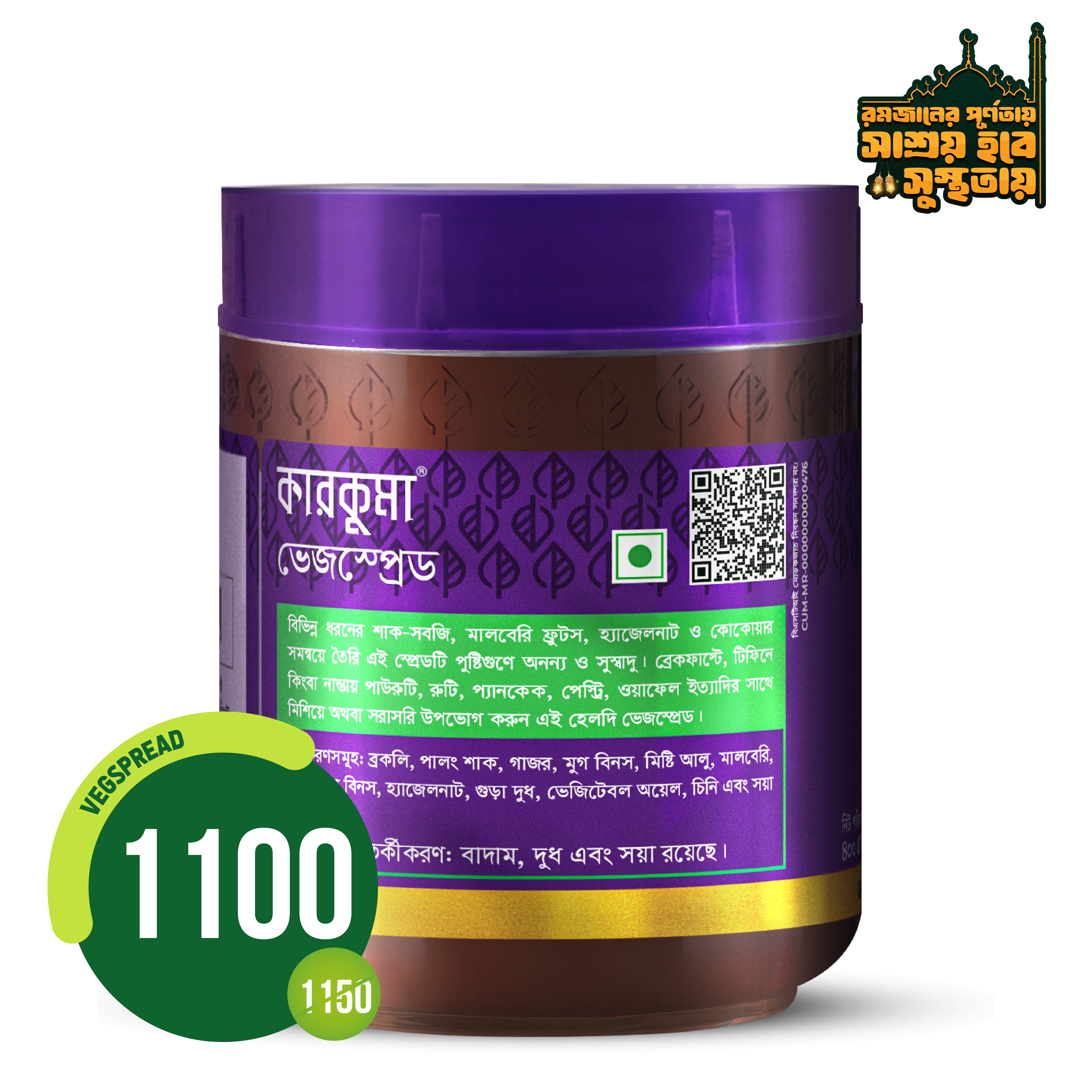 কারকুমা ভেজস্প্রেড একটি অনন্য এবং স্বাস্থ্যকর চকলেট স্প্রেড, যেখানে এক দারুণ মেলবন্ধন হয়েছে স্বাদের সাথে পুষ্টির। বাছাই করা সেরা সব উপাদান দিয়ে তৈরি এই স্প্রেডটিতে রয়েছে পালং শাক, ব্রকলি, গাজরসহ অন্যান্য ভেজিটেবলস; সাথে মালবেরি ফল, হ্যাজেলনাট ও কোকো বিনসের পুষ্টিকর মিশ্রণ। সব বয়সের মানুষের জন্য এটি একইসাথে পুষ্টিকর এবং মুখরোচক। কারকুমা ভেজস্প্রেড খেতে পারেন রুটি, টোস্ট বা প্যানকেকের সাথে, অথবা সরাসরিও উপভোগ করতে পারেন এর স্বাদ।