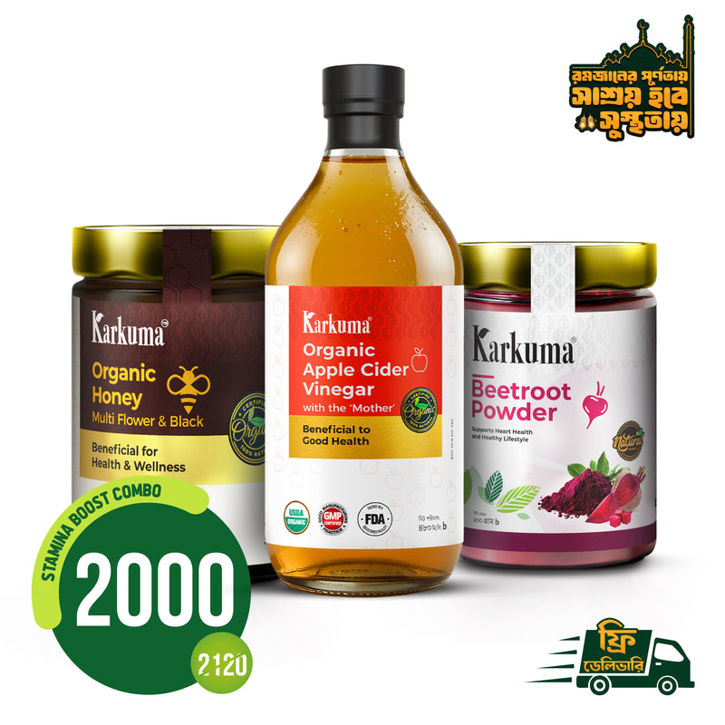 Karkuma Stamina Boost Combo is combination of Apple Cider Vinegar with Mother, Honey, and Beet Root Powder creates a powerful natural health tonic. Apple Cider Vinegar with Mother is rich in probiotics and enzymes that support gut health, detoxification, and metabolism. Honey adds natural antioxidants and antibacterial properties, boosting immunity and providing quick energy. Beet Root Powder contributes essential nutrients and natural nitrates that improve blood circulation, stamina, and heart health. Together, this blend helps enhance digestion, strengthen immunity, increase energy, and promote overall wellness.